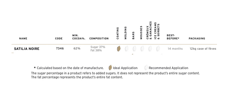 Satilia Noire 62% ostavlja na nepcu gorki aromatični osećaj i suptilne slatke arome badema na koje se lagano nadovezuju istrajne note pečene čokolade.